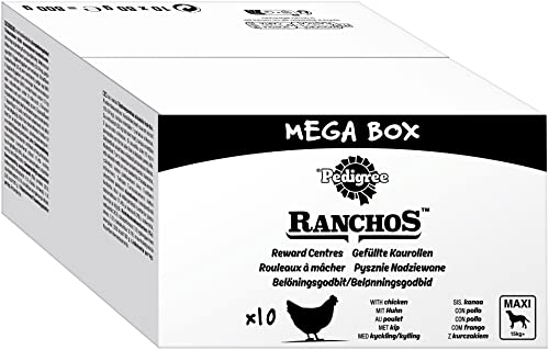 PEDIGREE RANCHOS Beutel Multipack Mega Box Gefüllte Kaurollen mit Huhn 10 x 80g Maxi 15kg -